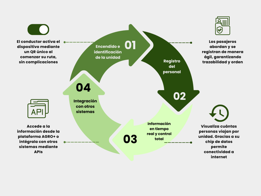 Dispositivo inteligente que optimiza y digitaliza el transporte de personal agroindustrial, garantizando eficiencia, trazabilidad y pagos justos en base a datos reales.