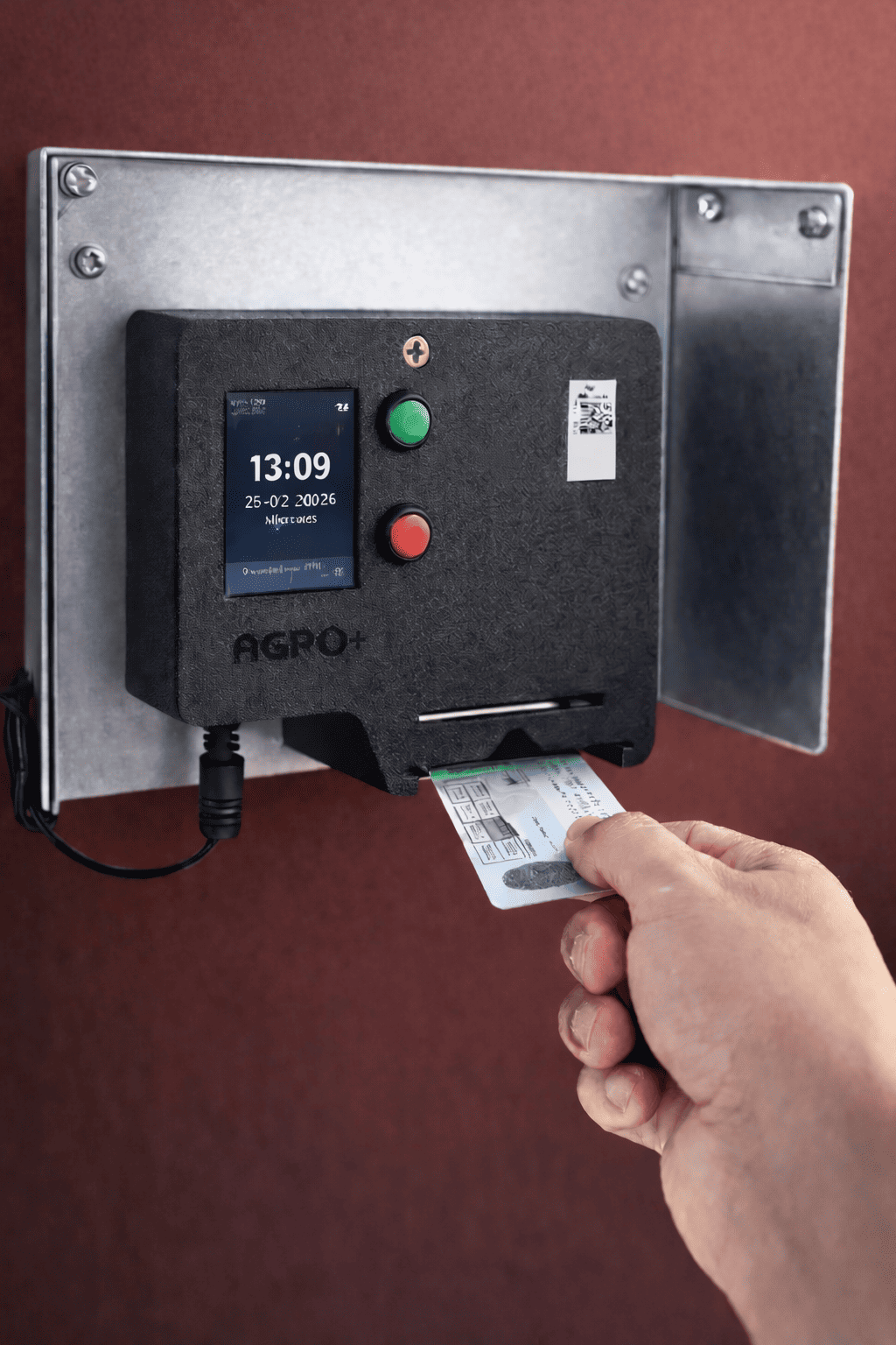 La pantalla muestra la hora actual al momento de la marcación, brindando referencia inmediata al trabajador.
