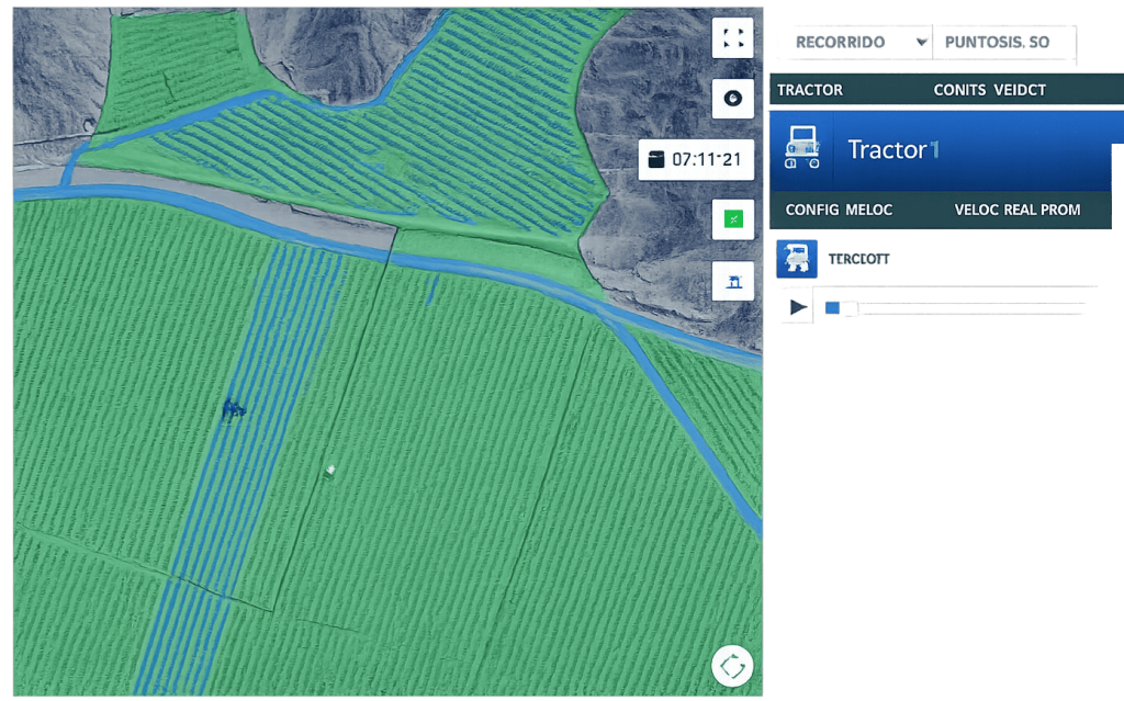 Dispositivo de monitoreo de alta precisión para agricultura, que registra recorridos centimétricos de tractores y los convierte en mapas, reportes y alertas para auditar operaciones en campo